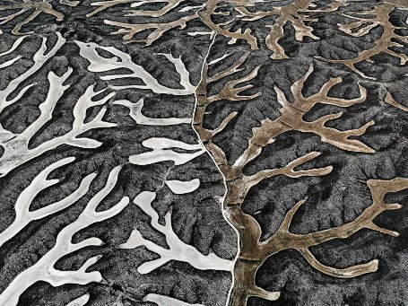 der anderen. ![]() Erst das zweite, genaue Hinschauen beantwortet einerseits die Frage „Gemälde oder Fotografie?“ und enthüllt andererseits das Schockierende im Schönen: Was da so hübsch schillert, sind Giftkloaken im oder Ölfilme auf dem Meer; die Delta-Verzweigungen des Colorado River erweisen sich als vertrocknete Überreste einstiger Flusspracht; die Bewässerung von Städten und Feldern in trockenheißen Gegenden treibt erbarmungslosen Raubbau am natürlichen Wasserreservoir.... Der aufmerksame Blick macht die Burtynsky-Ausstellung für die Besucher zum nachgerade erschütternden Erlebnis, weil diese Bilder von Zerstörung zeugen – und dabei doch von einnehmender Ästehtik sind. Am