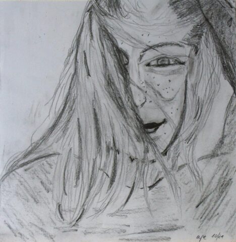 Titel: Verhaartes Frauenantlitz . Bleistift auf Papier, 22 x 22 cm, Herbst 2021. (c)Andreas Pecht