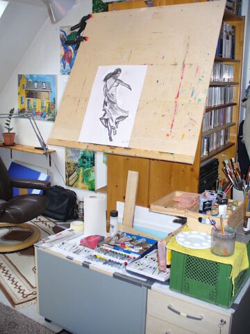 Hinter den Kulissen ist Platz noch in der kleinsten Hütte. In diesem Fall sagte man besser: Stube. Es hat gerade mal 20 Quadratmeter, mein Ruhestand-Arbeitszimmer unterm Dach. Aber was steckt da nicht alles drinne: Schreibtisch über Eck unter der Dachschräge; Malatelier mit Staffelei und Co. mittig im Raum; Medieneck mit Lesesessel, CD-Sammlung, kleinem Fernseher und prima Stereoanlage bestehend aus Radio, Kassettendeck, CD-Player UND Plattenspieler; zwei Regalwände für Lexika und Kunstbände. Jetzt auch noch meine ganz private Galerie. Für deren Hängung meiner liebsten Malarbeiten müssen Bücher und CDs derweil in den Schatten treten. Sie haben mir Jahrzehnte Gesellschaft geleistet, nun aber sind die neuen Mitbewohner dran, mir beim Malen oder Schreiben über die Schulter zu schauen – mal skeptisch bis kritisch brummend, mal Ermunterung zusprechend, mal verführerisch Süßholz raspelnd.