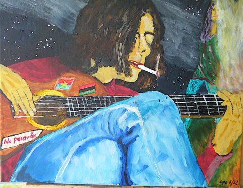 Titel: Selbstporträt Nr. 1 – Damals (am Lagerfeuer)“. Acryl/Aquarell auf Leinwand, 50×40 cm, 1.6.2022 (c) Andreas Pecht