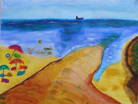„Kleiner Strand an Sandbank“. Gouache auf Leinwand, 50 x 40 cm, 22.07.2022