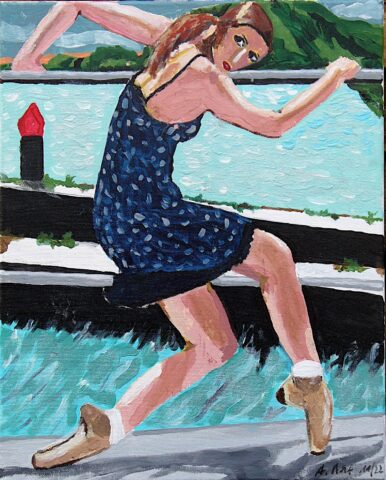 „Tänzerin an der Mole“, 40 x 50 cm, Acryl auf Leinwand. 5.11.2022 (c) Andreas Pecht