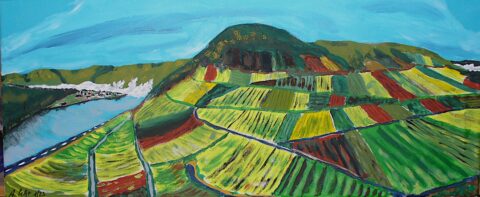 Titel: „Herbstliche Mosellandschaft mit Frühnebel“. Frei nach einem Panoramafoto von Jens Weber. (70 x 29 cm, Acryl auf Leinwand). 25.1.2023 (c) Andreas Pecht