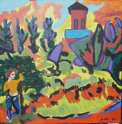 Titel: „Meine Eva in Schmidt-Rottluffs Park mit Turm“. 50 x 50 cm, Acryl auf Leinwand. 17.02.2023 (c)Andreas Pecht