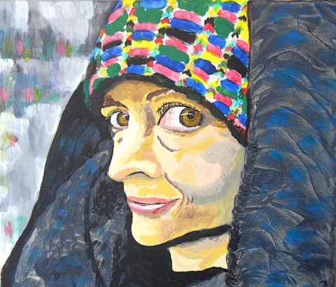 Titel: Frau mit Mütze in Decke gehüllt. Acryl auf Leinwand, 50 x 50 cm, 5.3.2022. (c) Andreas Pecht