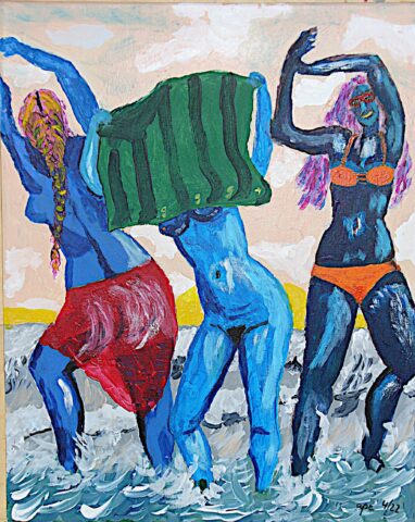 Titel: Sommerfreuden – drei Grazien (inkognito). 40 x 50 cm, Acryl auf Leinwand. 5.4.2022 (c) Andreas Pecht