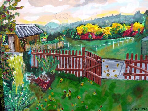 Titel: Oktober vor dem Haus. 60 x 50 cm, Acryl/Goauche auf Leinwand. 20.10.2022 (c)Andreas Pecht