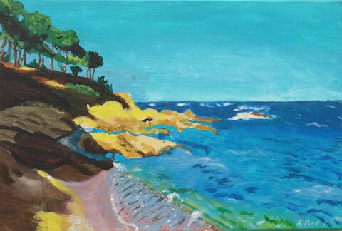 Titel: Küstenlandschaft ohne Mensch. 60 x 40 cm; Acryl, Gouache auf Leinwand. 19.8.2023 ©Andreas Pecht