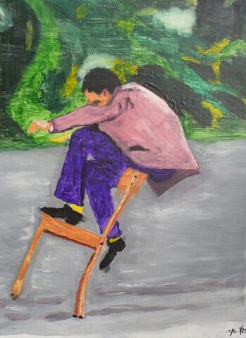 Titel: „Der Zappler auf dem Kippstuhl“. Aquarell auf Leinwand, 30×40 cm, Mai 2021. (c)Andreas Pecht